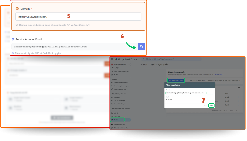 7. Cấp quyền API cho Google Search Console, Google Analytics 4, WordPress và WooCommerce bằng tài khoản quản trị viên (Đọc thêm Hướng dẫn cấp quyền trong Templates)