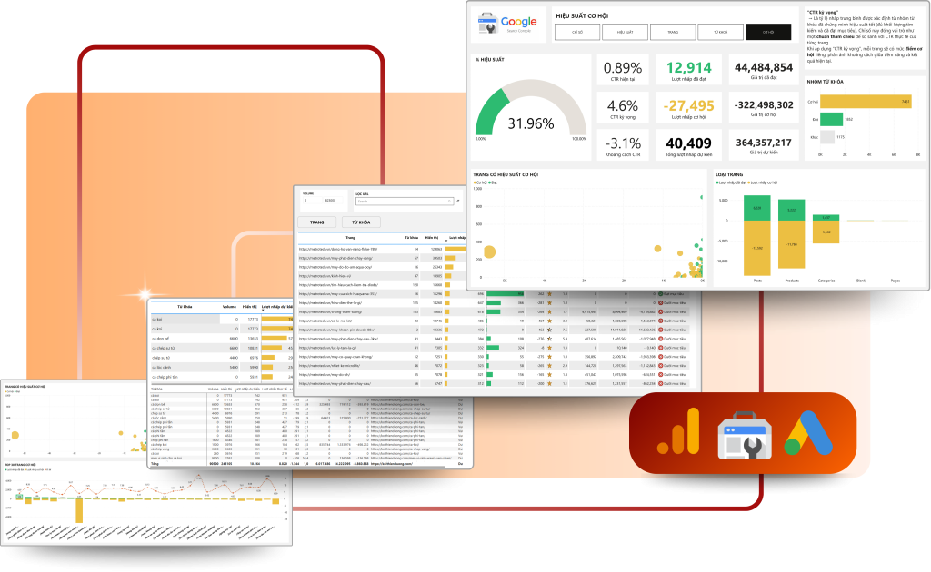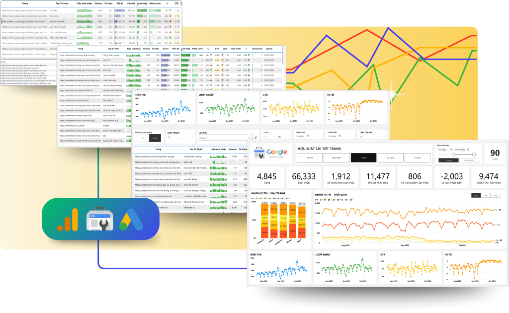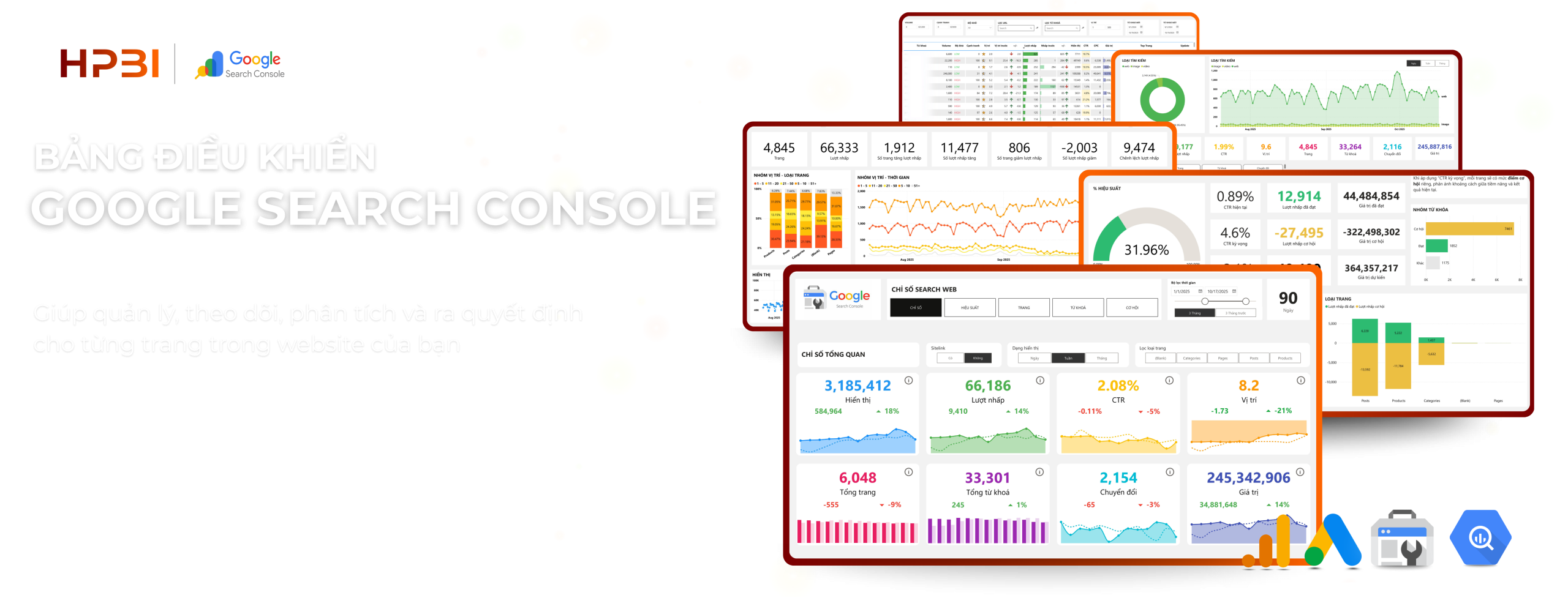 Dashboard SEO GSC - HPBI là một sản phẩm được xây dựng từ nhiều nguồn dữ liệu thông qua các API (Google Search Console, GA4, Google Ads, WordPress và WooCommerce), do đó có thể đánh giá được hiệu suất chi tiết về lượt hiển thị, lượt nhấp, CTR, vị trí trung bình, chuyển đổi và giá trị của mỗi trang.